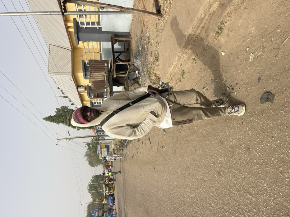A male individual walks on the dirt shoulder of a paved road in Chikaji, Nigeria