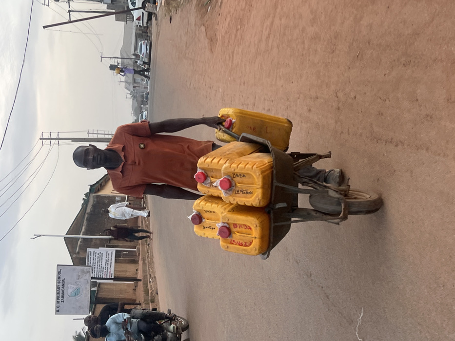 A man pulls a cart filled with yellow jerrycans labeled with names like "Baba" and "Dada". He wears an orange shirt and dark hat. The scene takes place on a paved road in a town. A school sign is visible in the background along with other people and vehicles. The sky is overcast.