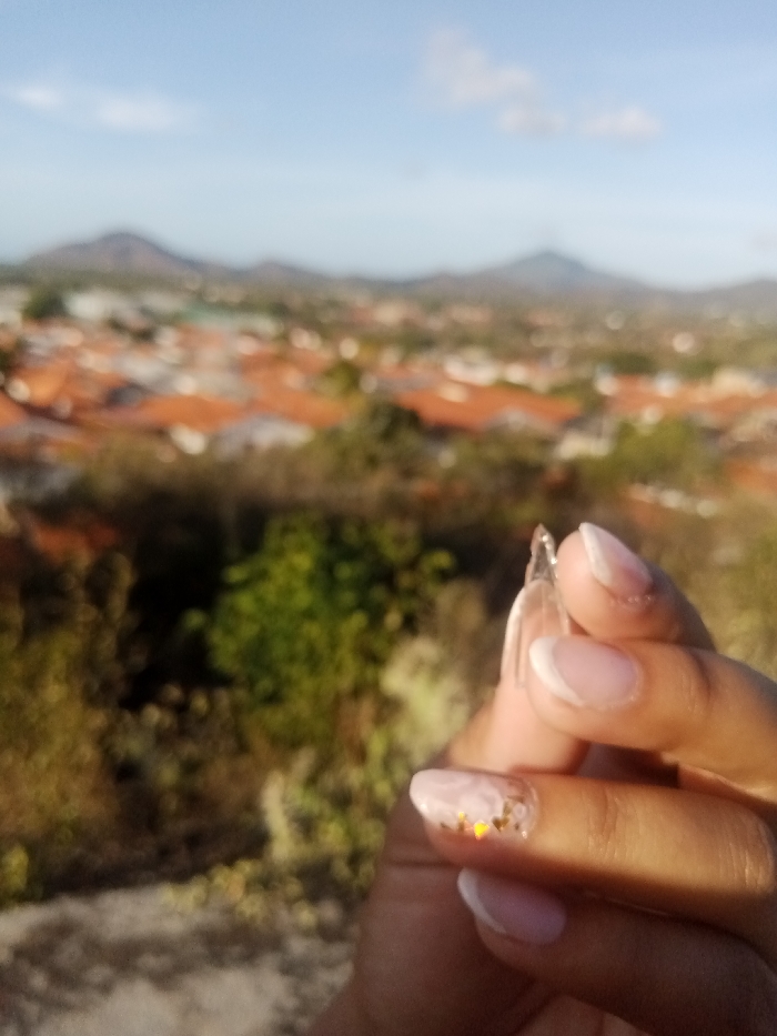 A human hand occupies the lower right foreground, holding a small, clear, irregular, shard-like object between the thumb and index finger. The fingernails are manicured; the thumb, index, and pinky fingers feature a French tip style, while the ring finger's nail is adorned with a clear overlay containing gold-colored glitter. The background, out of focus, presents an expansive view of the city of Altagracia, Venezuela. The urban landscape is characterized by numerous buildings with distinctive reddish-orange tiled roofs, interspersed with green vegetation. A mountain range is visible on the distant horizon, under a light blue sky with scattered white clouds. The scene is illuminated by natural daylight.