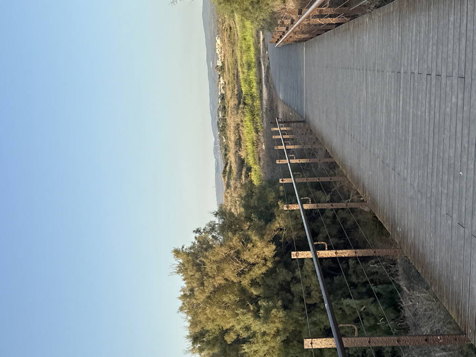 An outdoor scene in the Hof HaCarmel Regional Council, Israel, presents a wooden boardwalk path extending into the mid-ground under a clear, light blue sky. The path is constructed from weathered, greyish-brown horizontal planks, leading straight initially before curving gently to the right. Both sides of the boardwalk are bordered by railings composed of vertically spaced, rusty-brown posts supporting multiple horizontal dark metal cables and a top handrail. Small, dark, U-shaped hooks are affixed to the posts, hanging from the handrail. To the immediate left of the boardwalk, dense, light green and yellowish-green arboreal vegetation fills the lower left quadrant of the frame. To the right of the path, the ground is covered with dry, light brown grasses and scattered patches of bright green low-lying vegetation. In the distant background, several light-colored buildings with distinct roofs are visible atop a gentle rise, set against a horizon of undulating terrain. The sky occupies approximately the top third of the image and is uniformly clear, devoid of clouds. No individuals, animals, or explicit actions are observed within the frame. Natural daylight illuminates the scene, highlighting the right side of the railings and vegetation.