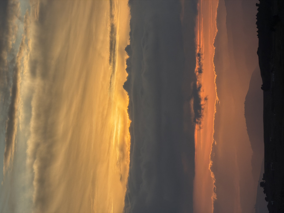 The image depicts an expansive view of a mountainous landscape at either sunrise or sunset, indicative of the region surrounding Peso da Régua, Portugal. The sky dominates the upper two-thirds of the frame, characterized by horizontal bands of clouds. The upper section displays a mixture of bright orange and yellow light, with visible streaky cloud formations. A concentrated area of intense yellow light, consistent with an obscured sun, is present in the upper-middle left, partially veiled by darker clouds. Below this, a dense, dark grey cloud mass extends horizontally across the mid-section of the image, presenting an irregular, lumpy upper contour. Beneath this dark layer, a vibrant band of reddish-orange light and illuminated clouds is visible, casting a glow on the atmosphere. The lower third of the image consists of multiple layers of dark, silhouetted hills and mountains, receding into the distance and appearing progressively lighter due to atmospheric haze. The immediate foreground shows a dark, undulating terrain with indistinct features, possibly including faint outlines of structures or sparse vegetation. No human subjects, animals, or specific objects are identifiable within the scene.