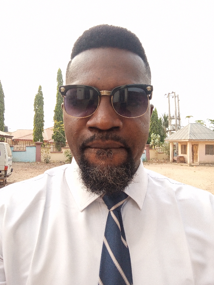 A man wears sunglasses, a white shirt, and a blue tie. He has dark hair and a beard with some gray hairs. The background shows an outdoor scene with trees, buildings, and an overcast sky. A small, rectangular structure with a gray roof is also visible. The man is positioned in the foreground, taking up most of the frame.