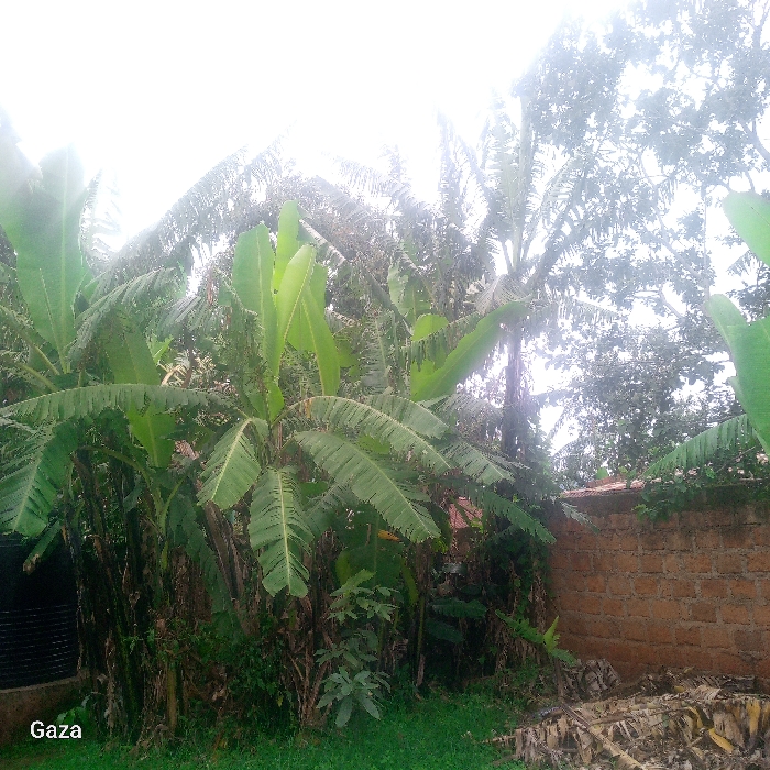The scene is located in Kamera ward, Kenya. It depicts a dense outdoor area dominated by tropical vegetation under a bright, diffused sky. Numerous large banana plants with broad green leaves and thick stems occupy the majority of the frame, with taller broadleaf trees visible in the background. Green grass covers the foreground, and a pile of dried banana leaves and plant debris is present on the ground in the lower right. A reddish-brown brick wall, constructed in a stretcher bond pattern, serves as a boundary from the lower right towards the center-right. A dark, partially obscured structure with horizontal slats is visible behind the banana plants in the lower-left corner. No individuals or active human presence are visible. The word "Gaza" is overlaid in white text in the bottom-left corner of the image.