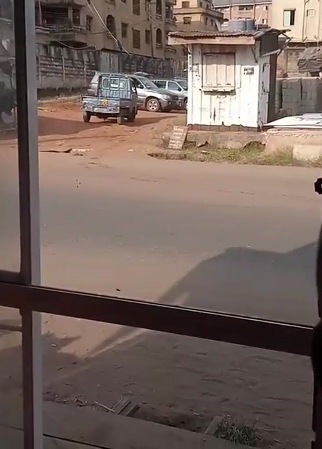 The scene is viewed through a pane of glass and shows a street in a city or town