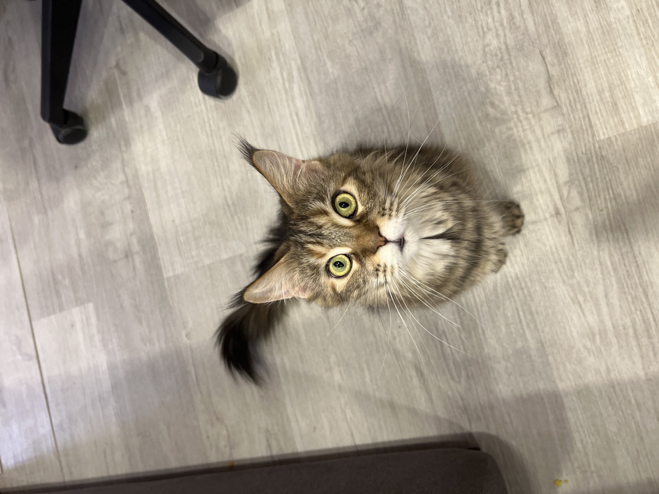 A long-haired domestic cat, likely a tabby Maine Coon or similar breed, is centrally positioned and facing directly towards the camera in an indoor setting in Rusanovo, Russia. The cat possesses prominent ear tufts, bright green-yellow eyes with dilated pupils, a lighter muzzle, and a fluffy brown and black striped/swirled coat pattern. It is sitting upright on its haunches, with its front paws tucked, gazing intently upwards with its mouth slightly agape. The whiskers are long and spread. The flooring consists of light gray wood-effect laminate or vinyl planks. In the upper right background, a portion of a black office chair base with two wheels is visible. To the far left, a dark brown/grey furniture item is partially observable. The scene is illuminated by an overhead light source, casting subtle shadows. No human figures are present.