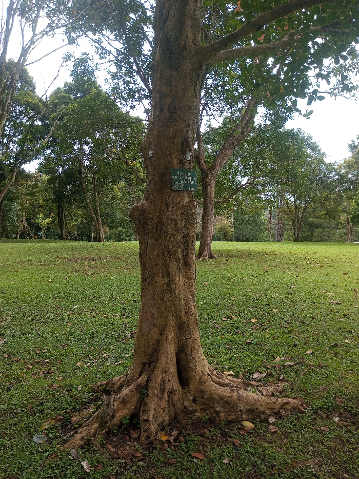 A large tree dominates the foreground, its thick, textured trunk rising from prominent roots. A small, rectangular green sign is affixed to the trunk. Lush green grass, interspersed with leaves, covers the ground, stretching into the distance. Other trees are scattered in the background, creating a wooded area. The sky is visible through the trees' foliage.