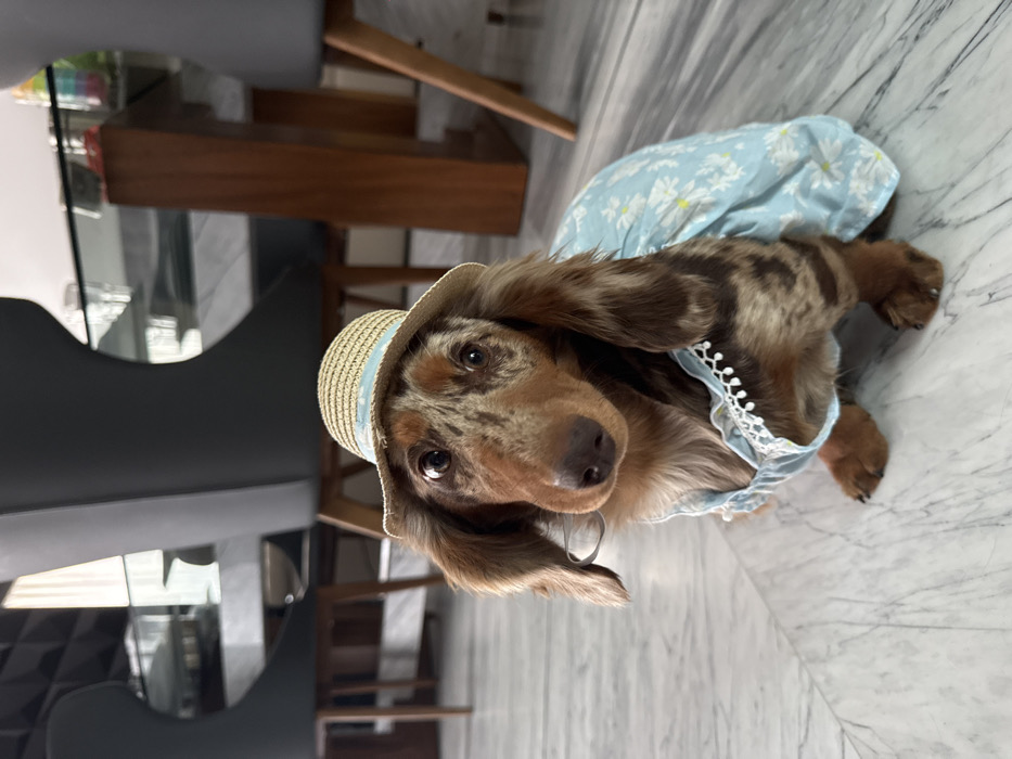 An indoor photograph displays a long-haired dapple dachshund dog seated on a light-colored marble floor featuring grey veining