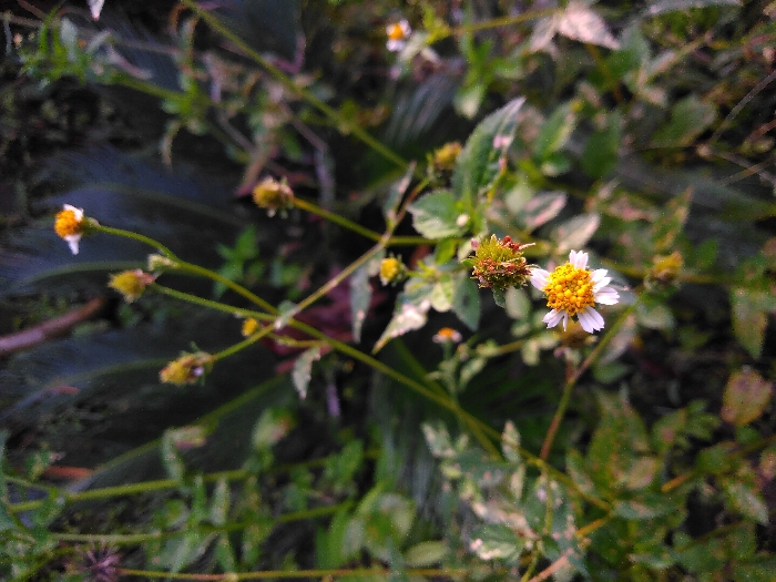 The image displays a close-up, top-down view of natural vegetation located in Mouangkeo, Laos. The primary subject is a *Bidens pilosa* flower, visible in the lower center, featuring white ray florets surrounding a central cluster of bright yellow disc florets. Immediately above this prominent bloom, a spent flower head with maturing achenes is identifiable. Multiple other *Bidens pilosa* flowers and buds, characterized by white petals and yellow centers or immature yellow-green structures, are distributed throughout the midground and background, appearing out of focus. The surrounding environment consists of dense green foliage, comprising numerous stems and leaves, some exhibiting lighter patches or variegation. No human subjects or man-made objects are present. The scene is illuminated by natural, diffused light.