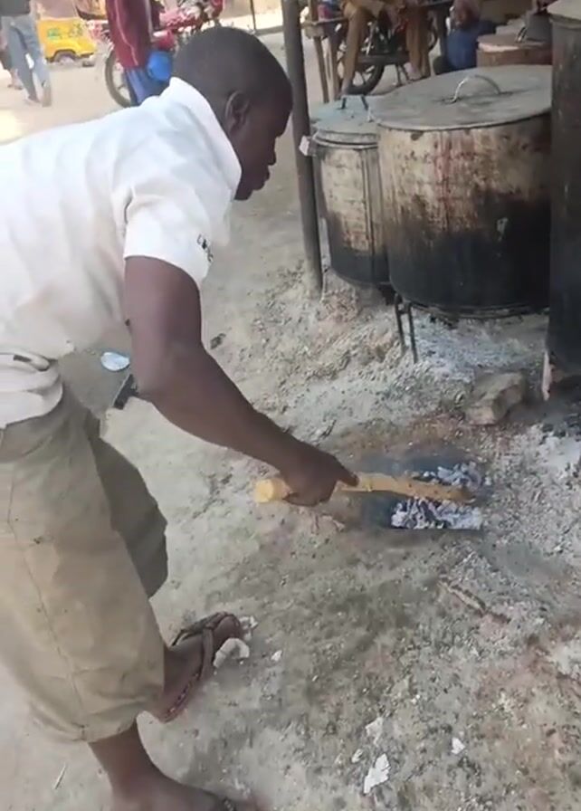man in a white shirt and khaki pants using a metal shovel to move burning coals from under large metal pots outdoors. He uses a wooden stick to help. The pots appear to be stained with soot from previous use. Other people are visible in the background, some sitting and some walking around in the open-air space. There are motorcycles parked nearby. The ground is a mix of dirt and concrete, with scattered ash. The setting appears to be a semi-permanent outdoor cooking area, possibly for a commercial or community event.