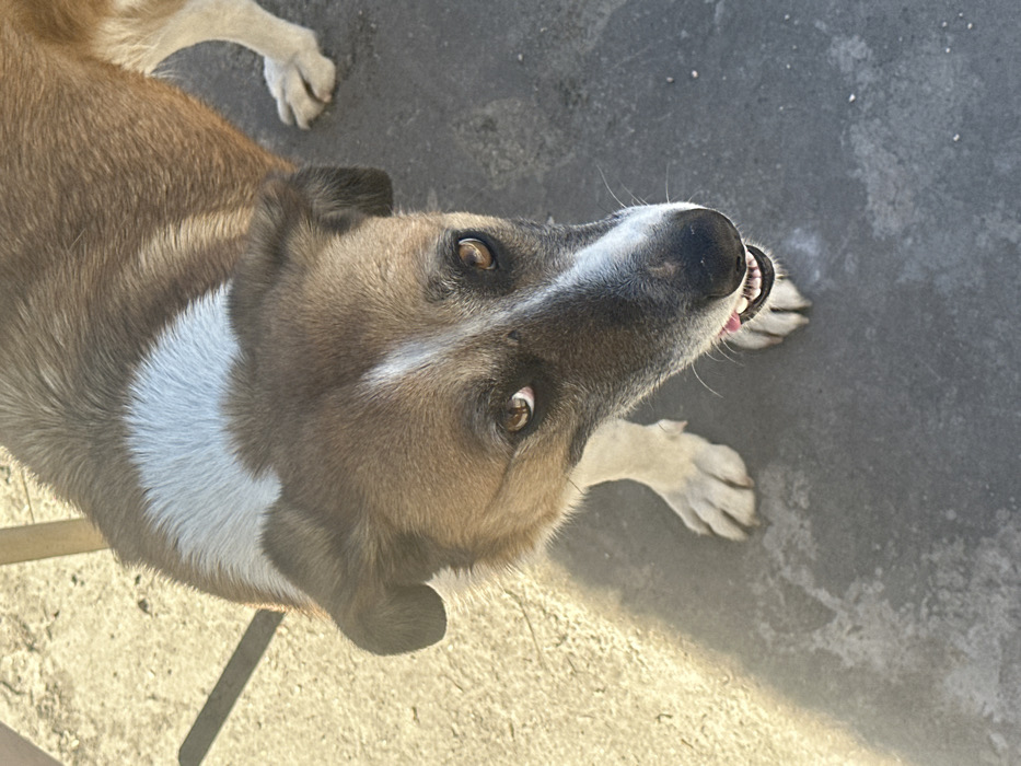 An outdoor, eye-level photograph captured in Semchinovo, Bulgaria, depicts a medium-sized canine looking directly upward towards the camera. The dog exhibits a tricolor coat: predominantly tawny brown on the body and head, with a distinct white patch on the upper back/nape, a white blaze extending from the forehead down the muzzle, and white markings on its chest and forepaws. Darker brown/black fur is present around the eyes and muzzle. Its eyes are dark brown, reflecting ambient light. The dog's mouth is slightly open, revealing its lower teeth and the tip of a pink tongue. The canine's front paws are visible on a concrete surface, which is illuminated by strong, directional sunlight. Shadows from the dog and an unseen object (possibly a pale furniture leg) are cast onto the concrete, indicating direct sun exposure. The concrete ground ranges from light gray in sunlit areas to darker gray in shaded regions, with visible texture and minor debris.