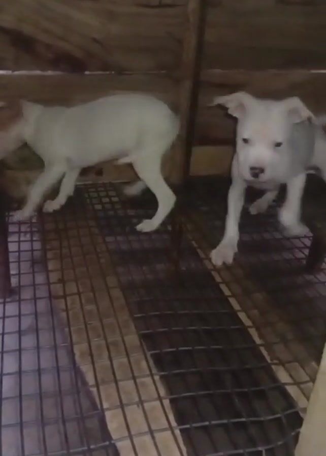 - "Two small, white puppies are in a wooden crate with a metal wire floor" by FM-aKj7t1, licensed under CC BY 4.0
