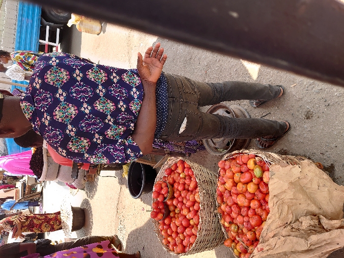 The image depicts an outdoor market scene in Adankolo, Nigeria, under bright daylight