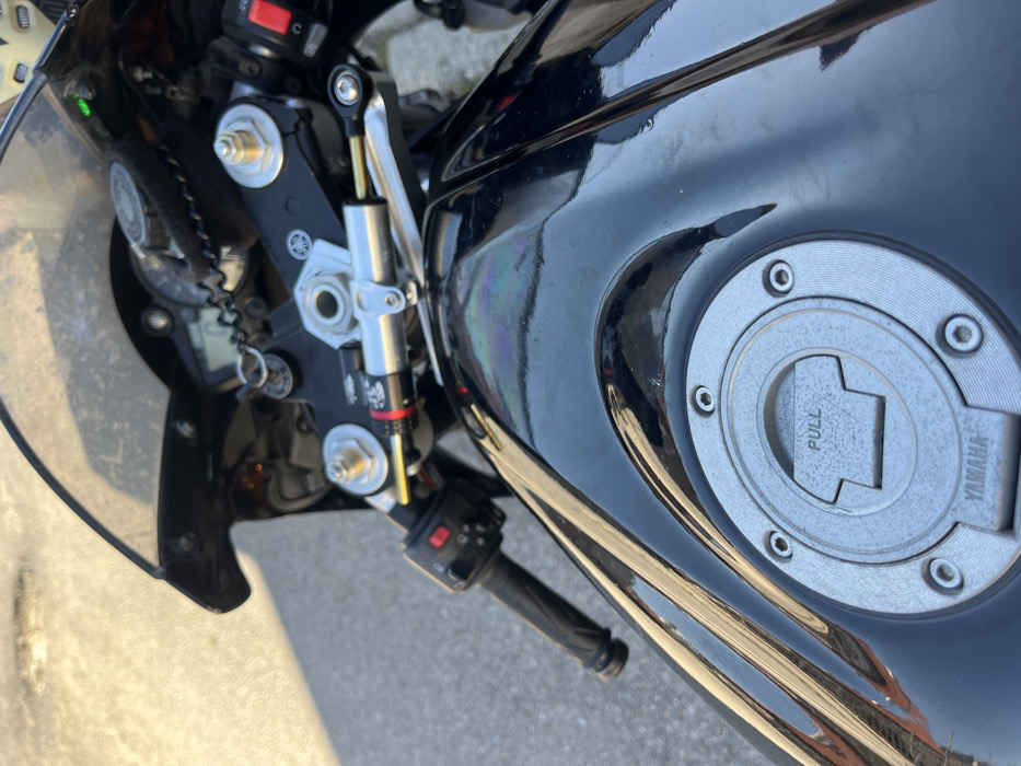 The image displays a close-up, top-down perspective of the front section of a black Yamaha sport motorcycle, stationary on an asphalt surface in the city of Unknown, Unknown. The glossy black fuel tank is prominent, featuring a silver circular fuel cap with "PULL" embossed on its central lever and "YAMAHA" text visible at its base. Iridescent reflections, consistent with oil residue or light interference, are present on the tank's surface. Above the tank, black clip-on handlebars are visible, with the left grip and an associated control cluster featuring red buttons. A silver-colored steering damper, equipped with gold-colored components, is mounted across the black top triple clamp. The instrument cluster is partially visible beneath a dark windscreen, displaying an ignition key with a coiled lanyard and an illuminated green indicator light. The ground is an asphalt surface, showing variations in tone consistent with natural light exposure. No individuals are present in the scene.