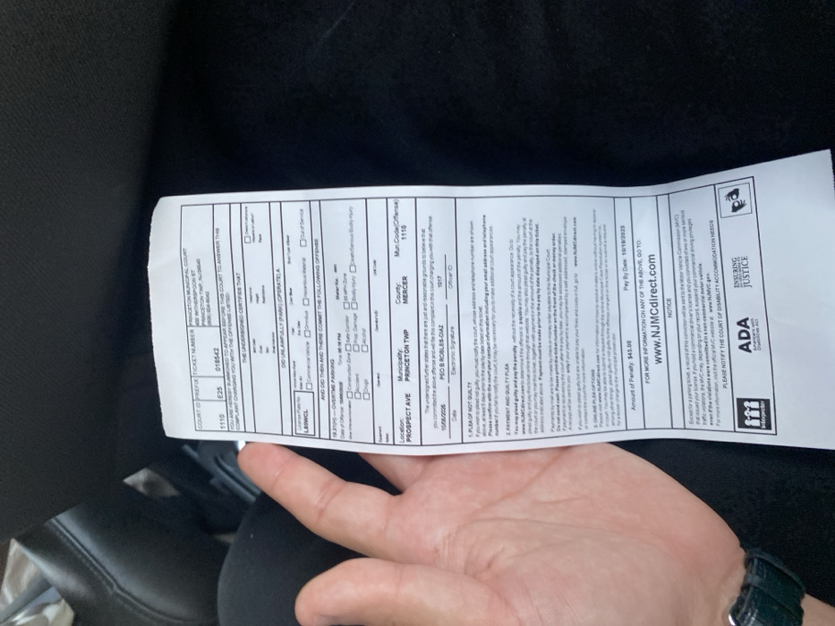 The image depicts a white paper parking ticket held vertically in a person's left hand, visible from the wrist up, inside a vehicle. The background consists of out-of-focus, dark, textured upholstery, likely a car seat. The ticket is issued by Princeton Municipal Court, located at 400 Witherspoon Street, Princeton, New Jersey, United States. The offense listed is "OVERTIME PARKING" (19:21(P)) which occurred on Prospect Avenue in Princeton Township, Mercer County, on October 6, 2005. The ticket specifies a license plate of L80WCL and an officer identified as PEO B ROBLES-DIAZ (ID: 1017). The penalty amount is $45.00, with a pay-by date of October 19, 2025. The ticket includes instructions for payment via NJMCDirect.com and displays logos for Interpreter, ADA, and Ensuring Justice.