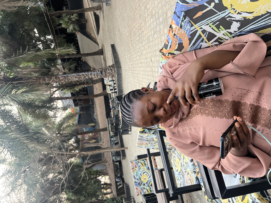 The image depicts an outdoor lounge or restaurant area in Ado, Nigeria, with a paved ground under an open sky