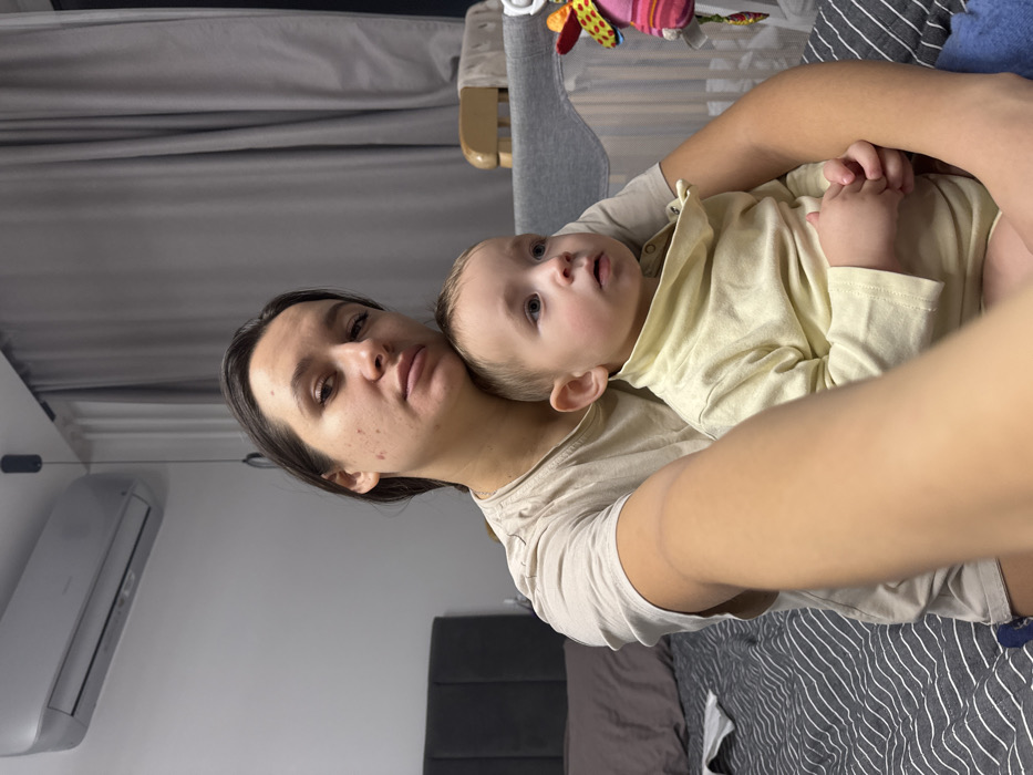The image depicts an indoor residential scene, likely a bedroom or nursery, situated in Odintsovo, Russia. An adult female, estimated to be between 25 and 35 years old, with dark hair, is featured prominently in the foreground, holding an infant or toddler, approximately 1-2 years old. The female, wearing a light-colored t-shirt, maintains a neutral expression and looks directly into the camera, indicative of a selfie capture. The child, with light hair and blue eyes, is dressed in a light yellow long-sleeved turtleneck-style top, looking towards the right side of the frame with hands clasped. The background on the left reveals a bed equipped with a dark grey upholstered headboard and covered by a grey and white striped duvet. A dark grey pillow and a crumpled white cloth are visible on the bed. To the right, a segment of a wooden crib or playpen with a grey fabric side barrier is present, from which a colorful soft toy with red, yellow, and green elements hangs. A white wall-mounted air conditioning unit is affixed to the ceiling in the upper left of the frame. A black pendant light fixture extends from the ceiling centrally. Grey curtains cover a window positioned on the far right. The walls are a light, uniform color, and the scene is illuminated by interior lighting.