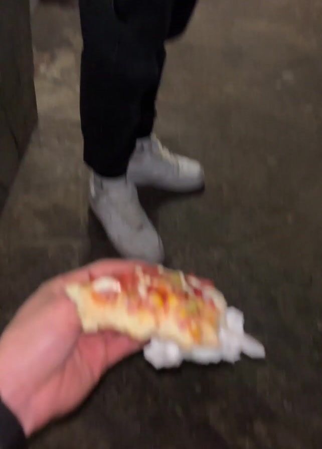 The video begins with a first-person view of someone holding a slice of pizza on a napkin