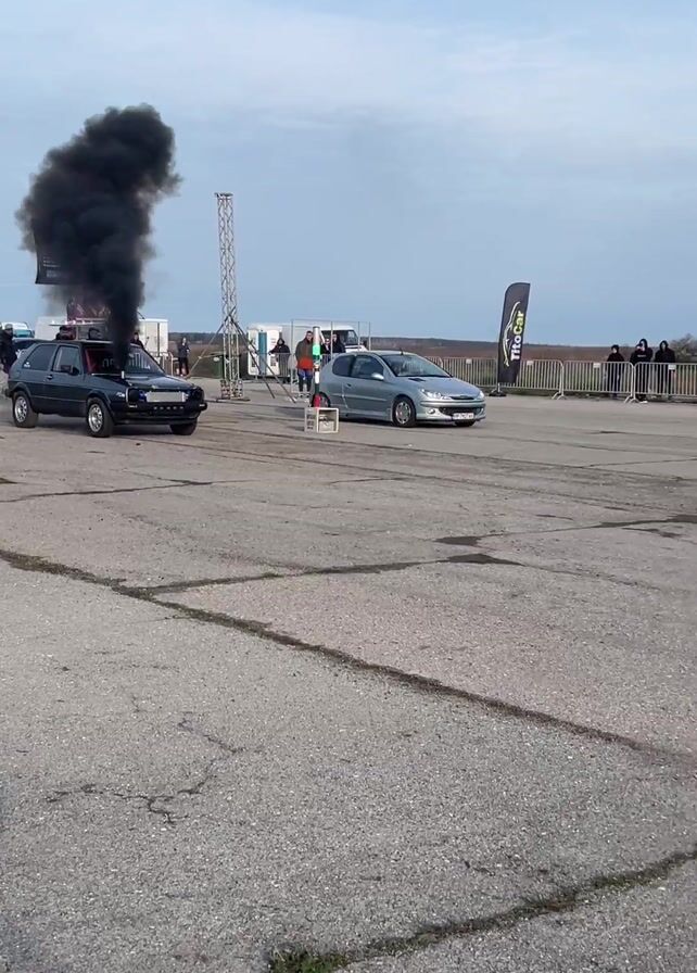 two cars, a gray Volkswagen Golf and a silver Peugeot 206, drag racing on an asphalt track. The Volkswagen Golf is billowing black smoke from its exhaust pipe, which is positioned vertically and rises above the roof. There is a crowd of people behind a barrier watching the race. In the background, there is a large screen with tuning advertisements on it, as well as a green tent. The sky is cloudy. The cars accelerate forward, leaving trails of dust and smoke behind.
