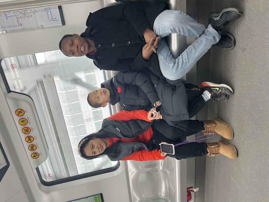Three people sit on a train. A man in a black coat and blue jeans sits above a child in a black jacket. A woman with a headband, wearing a red top and black vest, sits below the child and holds a smartphone. The train's interior is visible, featuring signs and a window overlooking buildings. Each person wears footwear appropriate for travel.