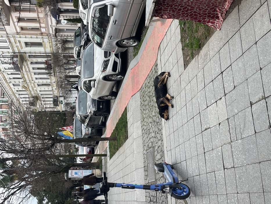 The image depicts an urban street scene in Batumi, Georgia, under an overcast sky. In the foreground, a blue and black electric scooter is parked on a grey tiled sidewalk, facing right. To its right, a medium-sized, short-haired dog, predominantly black with tan markings on its face and legs, lies on its left side on the grey paving stones, appearing to be asleep. A portion of a table with a red and white patterned tablecloth is visible on the far right. Midground elements include a line of bare deciduous trees bordering the sidewalk. To the left, several indistinct human figures are visible walking away from the camera on the sidewalk. A red-painted strip separates the sidewalk from a narrow patch of grass and a cobblestone-like surface where a series of vehicles are parked parallel to the curb. These vehicles include a dark-colored SUV (resembling a BMW X5), a white Mercedes-Benz GLA-Class SUV, and a silver Mercedes-Benz C-Class wagon. Further down the street, two flags, one displaying the blue and yellow of Ukraine and the other the red and white of Georgia, are visible above the parked cars. The background features multi-story buildings with light-colored, classical facades, characterized by multiple windows and ornate balconies, lining the opposite side of the street.