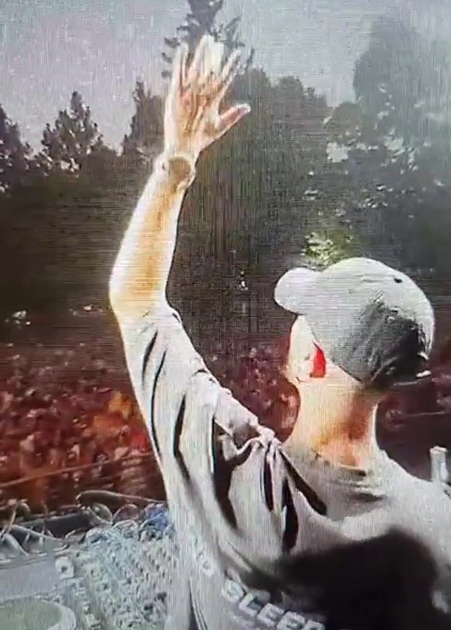man, presumably a DJ, standing at a DJ booth. He's wearing a grey T-shirt with the words "SLEEP CLUB" printed on the back and a grey baseball cap. He has his arm raised, waving to a large crowd visible in front of the stage. The background consists of trees and the sky. The lighting suggests it could be daytime or dusk. He appears to be interacting with the crowd, possibly during a live performance.