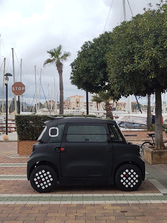 A matte dark grey Citroën Ami quadricycle is parked on a multi-toned brick paved walkway at a marina in Dénia, Spain