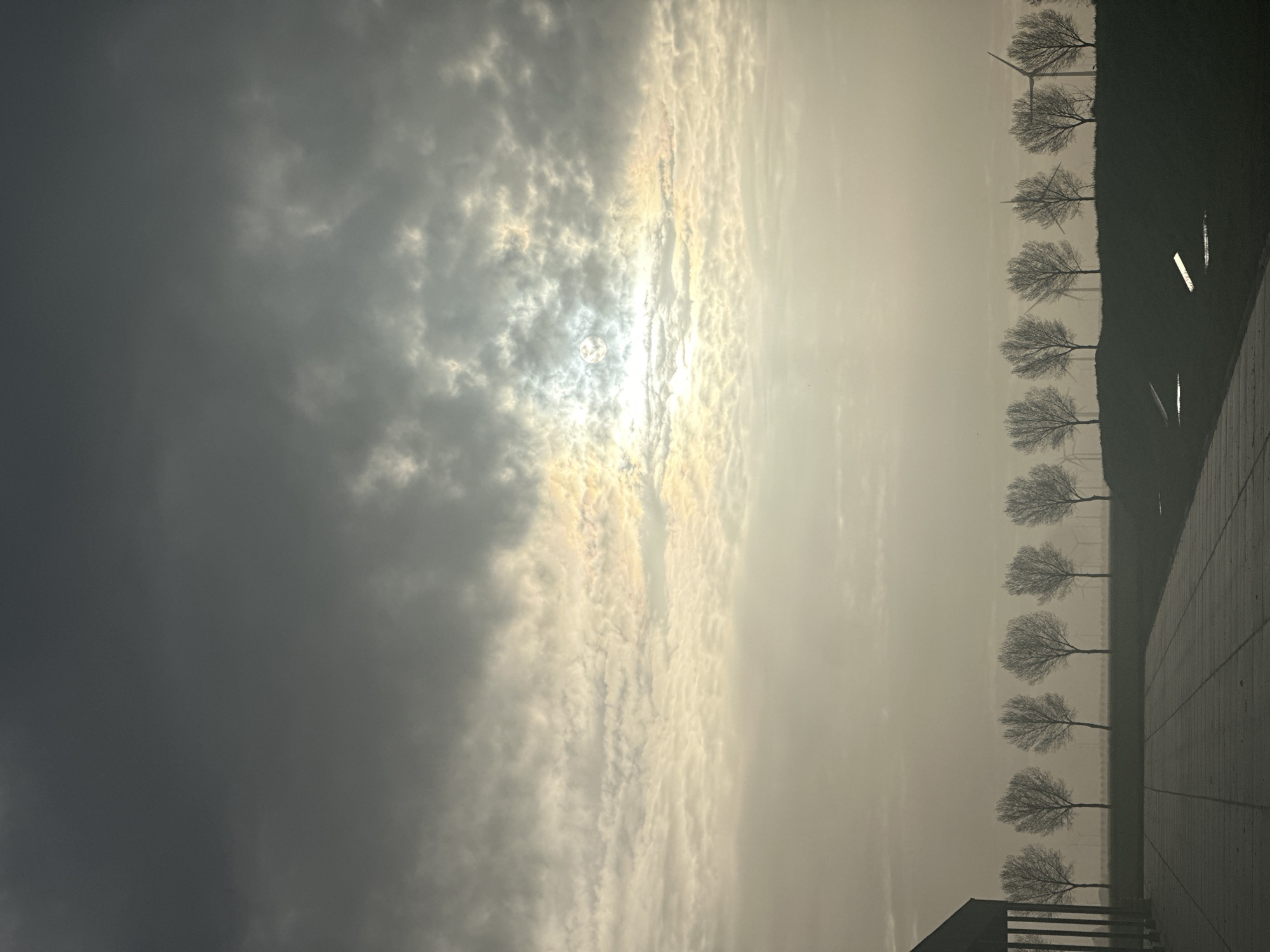 The image captures a landscape in Lelystad, Netherlands, characterized by a gloomy, overcast sky. The sun, obscured by layers of clouds, emits a diffused light. A row of bare trees lines the right side of the frame, their silhouettes stark against the misty background. In the distance, wind turbines are visible. A paved area or walkway is visible in the foreground.