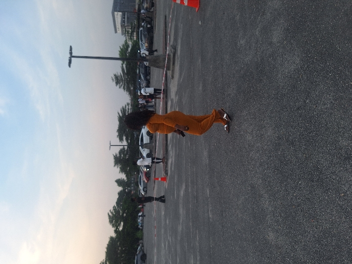 A woman in an orange outfit and black curly hair walks in a parking lot towards a gathering of people in white shirts. Cars and tall trees line the background, under a bright, light-blue and pale-orange sky. An orange cone is visible at the edge of the lot. A tall light pole is seen among the trees. The pavement is smooth, dark-gray.