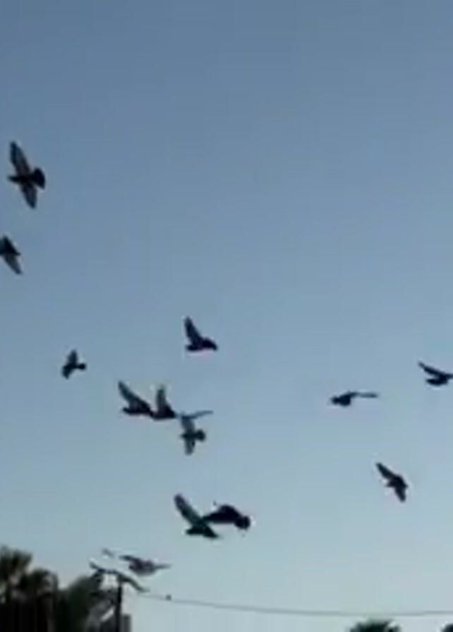 A flock of birds is flying across a blue sky. The camera pans across the sky and the scene changes to include trees, bushes, powerlines and a signpost on the ground. The birds continue flying.