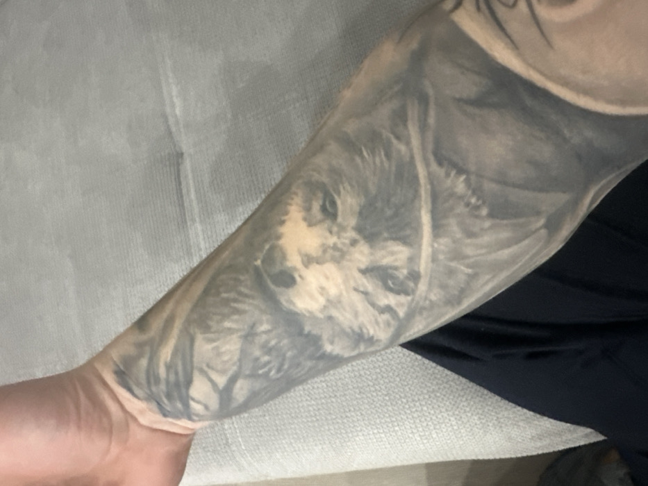 - "The image displays a close-up, angled view of a person's left forearm, which is extensively covered by a black and grey tattoo sleeve" by FM-tqWKn1, licensed under CC BY 4.0