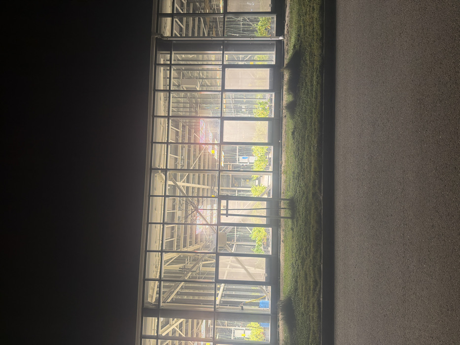The image displays a modern, multi-panel glass-fronted building at night, located in Plovdiv, Bulgaria. The dark, clear night sky occupies the upper third of the frame. The building's interior is brightly illuminated, revealing an organized environment consistent with a greenhouse or agricultural research facility. The facade features numerous rectangular glass panels framed by a light-colored grid structure. Visible through the glass are internal metal support beams and what appear to be white translucent screens or covers within various compartments. On the ground level inside, rows of green plants in dark individual pots are systematically arranged across multiple sections. Blue cylindrical barrels are discernible in the lower left interior, and white rectangular signs or labels are visible on internal structures. In the upper sections of some compartments, distinct sources of red-pink light are present, suggesting horticultural grow lights. In the foreground, a strip of unkempt green grass separates the building from a dark asphalt paved surface that occupies the bottom third of the image. A single, slender, leafless sapling is positioned centrally within the grass strip, directly in front of the building. No individuals or active subjects are visible within the scene.