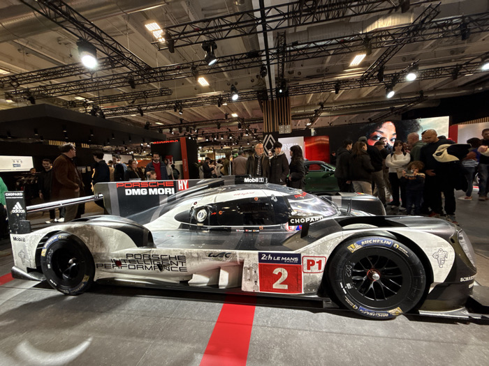 The image captures an indoor scene at an automotive exhibition in Vanves, France