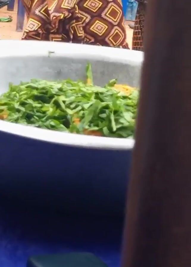 person standing in front of a large metal bowl filled with what appears to be food. The bowl is blue on the outside and silver on the inside. The food consists of a mix of green leafy vegetables and some orange-colored ingredients. The person is wearing a patterned brown and gold shirt. There is a stack of white plates to the left of the bowl and a black rectangular object on a blue surface in the foreground. Another person's arm is briefly visible on the right side of the frame. The background shows other people and some chairs.