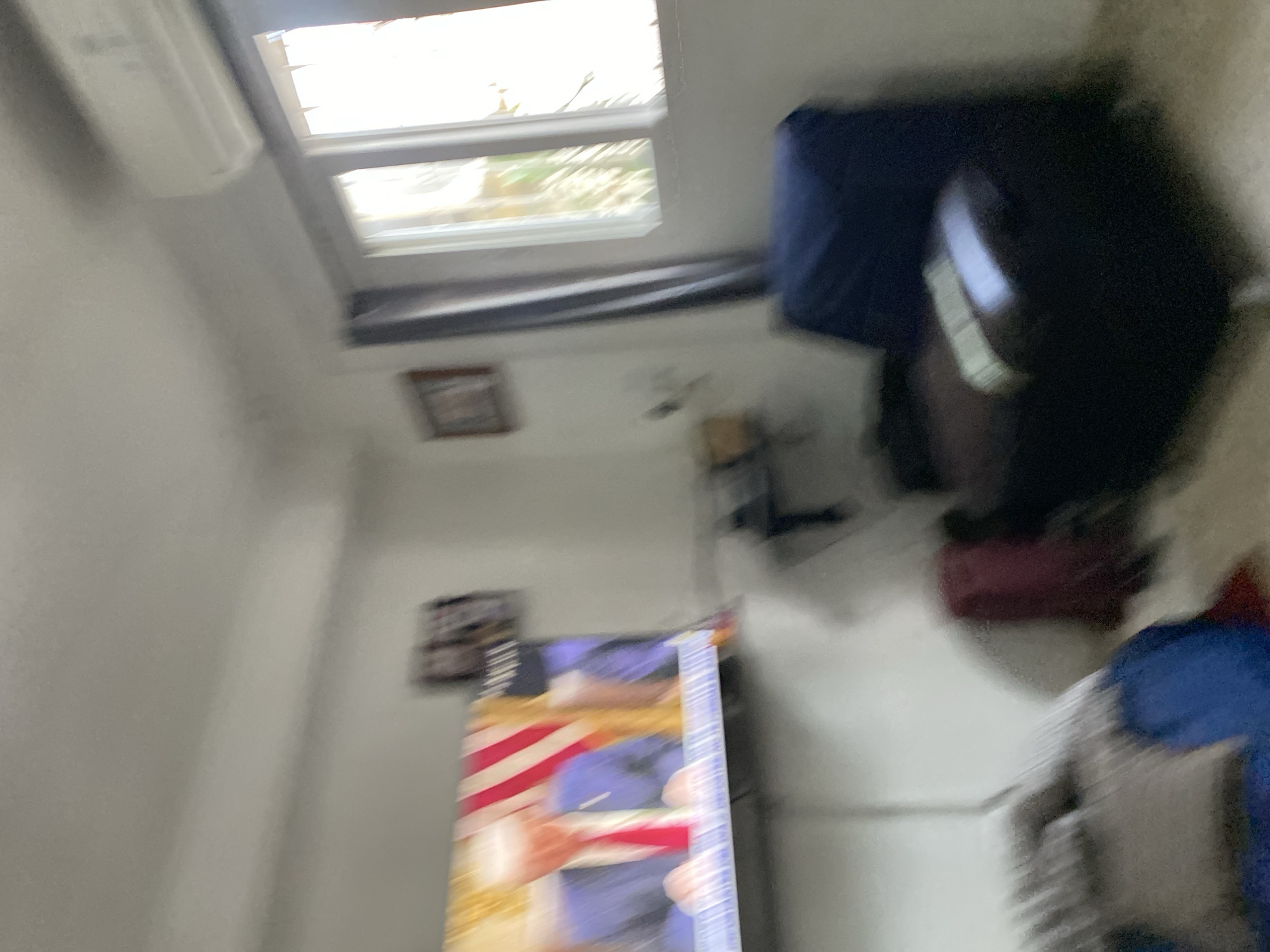 The image depicts an interior scene under natural light entering through a window at the top of the frame. A white air conditioning unit is mounted near the ceiling. A dark blue object, likely fabric, is draped near the window. Below the window on the wall, there is a framed picture and further down, another framed image is visible on the wall, alongside a partially visible poster featuring what appears to be an individual in blue attire and red and white stripes. A blue object with white details is in the foreground, along with a gray object. The overall image has motion blur, making specific details difficult to discern precisely.