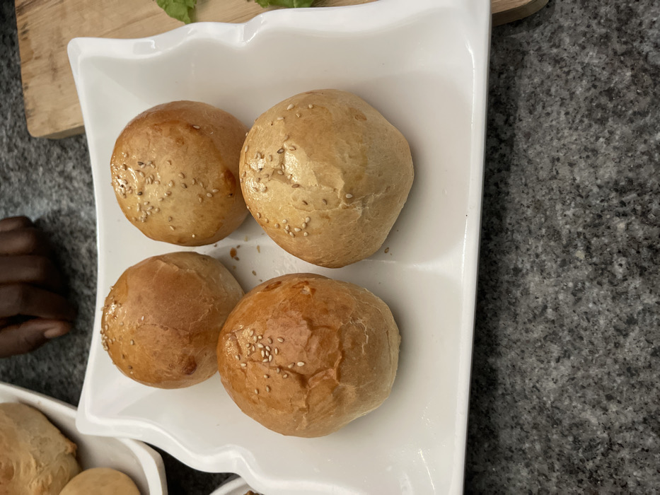 - "The scene, set in an indoor kitchen environment in Bar Jirgi Summa, Nigeria, features four freshly baked, golden-brown bread rolls, each topped with sesame seeds, displayed on a white, wavy-edged rectangular serving platter" by FM-6wY0i1, licensed under CC BY 4.0