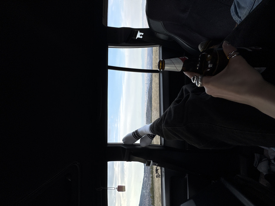 The scene depicts the interior of a vehicle, parked in an elevated position in Bistritsa, Bulgaria, with a panoramic view of a distant urban area. In the foreground, a human left hand, adorned with a large spherical silver ring on the index finger and a thin silver band on the ring finger, holds a brown glass bottle with a red and white label. Behind the hand, a person's legs are extended, clad in dark trousers and white crew socks featuring black text or stripes; their feet are propped against the left side window frame. Crumpled dark fabric is visible on the vehicle floor near the legs. The vehicle's interior components, including the headliner and window frames, are dark in color. A reddish-brown rectangular object, possibly an air freshener, labeled "X036," hangs from the ceiling near the left window. A dark, textured fabric seat is partially visible on the right. Through the vehicle's windows, the exterior environment shows a landscape under a partly cloudy sky. The immediate terrain is characterized by dry, light-colored grass on rolling hills. A dark, indistinct object is visible on a hillside in the mid-distance to the left. The background reveals a large, sprawling urban area with numerous buildings, extending across the horizon, consistent with a city view from an elevated vantage point.