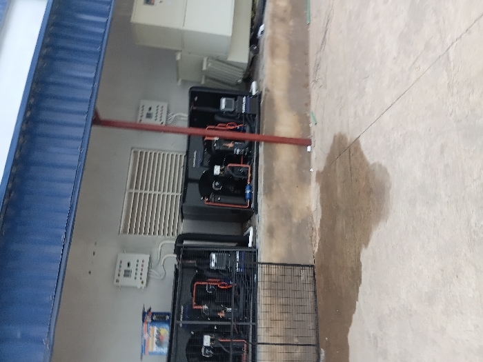 The exterior of a building features industrial equipment. Two black units with visible internal components sit outside, surrounded by metal cages for protection. A large air vent is visible on the wall above the equipment. A beige-colored concrete surface extends from the equipment to the right, with a dark, damp stain marking the ground. A blue awning is overhead. The equipment appears to be part of the building's cooling or HVAC system.