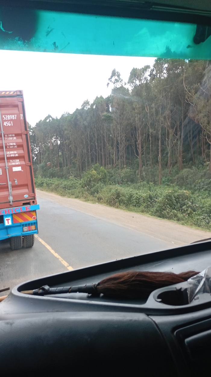 The image depicts a roadside scene in Limuru Central ward, Kenya, viewed from the interior of a vehicle. The top portion of the frame shows a turquoise-tinted sun visor or windshield strip with visible smudges, while the bottom reveals a dark dashboard. On the dashboard, a dark brown, tassel-like object resembling a fly-whisk or decorative broom, with a wrapped handle, rests horizontally, accompanied by a small, clear plastic bag. Through the windshield, a paved road stretches ahead with a solid yellow line visible on the left side. The road surface appears damp. In the left lane, a large commercial truck is visible, moving in the same direction. It carries a red shipping container with markings including "528987 45G1", weight specifications (32,500 KG / 71,650 LBS; 28,800 KG / 63,490 LBS; 3,700 KG / 8,160 LBS; 76.4 CUM / 2,700 CUFT), and a partial "THIO" logo. The truck's chassis is blue, featuring yellow and red reflective stripes and two visible rear tires on the left side. "VEHICLE" is stenciled on the blue chassis. To the right of the road, a dirt shoulder leads to a dense area of green undergrowth, followed by a thick forest of tall, slender trees, possibly eucalyptus or a similar species, with sparse foliage along their lower trunks. The sky above is overcast and light grey.