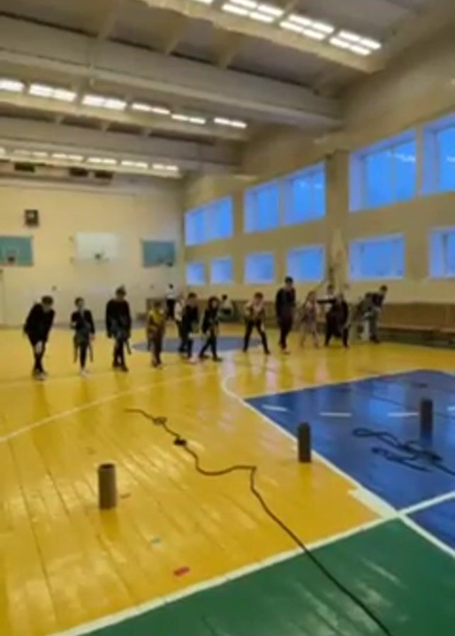 A medium shot shows an indoor group activity in a gymnasium. A group of around a dozen young people wearing harnesses are lined up to run forward towards a climbing wall on the far left of the scene. When the word "March" is uttered, they sprint forward toward the wall. There are several poles on the gym floor with a rope running between them. The gym floor is yellow with a blue rectangle in the center. The walls are pale yellow. There are several windows along the far wall. In the last few seconds, one person is visible up close. The person is wearing a black jacket with a light blue harness.