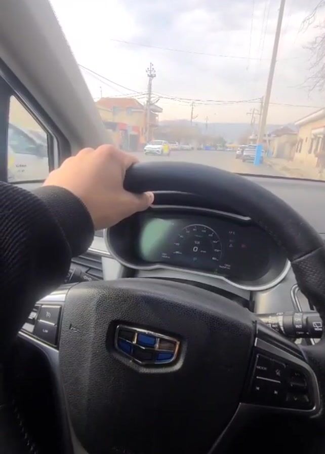 A driver's point-of-view shot inside a car, likely a Geely based on the steering wheel logo