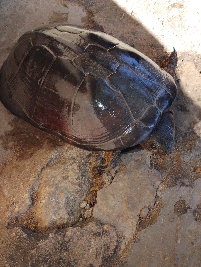 - "A dark-shelled turtle or terrapin is observed resting or moving on an uneven, broken concrete or stone surface" by FM-g0J513, licensed under CC BY 4.0