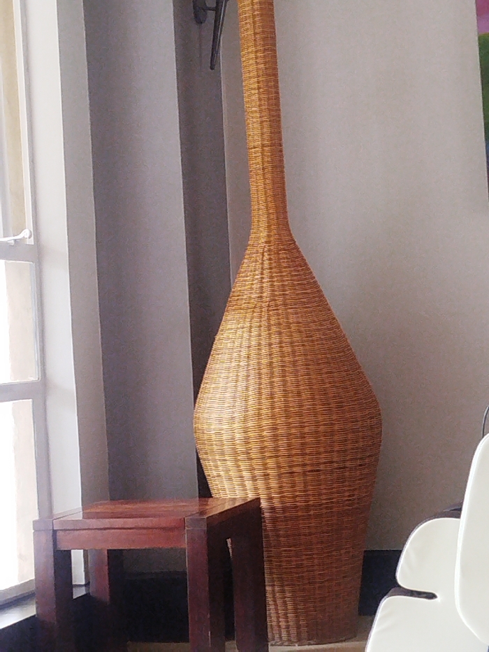 An indoor scene in Nairobi, Kenya, depicts a decorative arrangement within a room. The central object is a tall, floor-standing structure constructed from light brown woven material, likely wicker or rattan. It features a wide, bulbous base that gradually narrows into a lengthy, slender neck extending upwards. To the left of this object, a small, square side table crafted from dark brown wood is positioned. Further left, a white-framed window with a translucent covering is visible, and a light grey curtain hangs between the window and the woven object. A dark, wall-mounted fixture is partially visible on the wall above the woven object. The background consists of a plain, light-colored wall to the right, and a section of white, curved modern furniture, possibly a chair, is partially visible in the lower right corner. The scene is illuminated by natural light entering from the left, creating subtle shadows. No individuals are present.