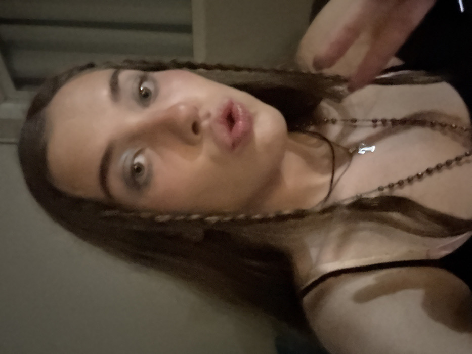 A woman with light skin and brown hair is looking directly at the camera with a slightly puckered expression. Her hair is styled with small braids along her forehead. She is wearing a thin-strapped top, and two necklaces are visible, one with a cross pendant. The image is taken from a low angle, creating an upward view of the woman.
