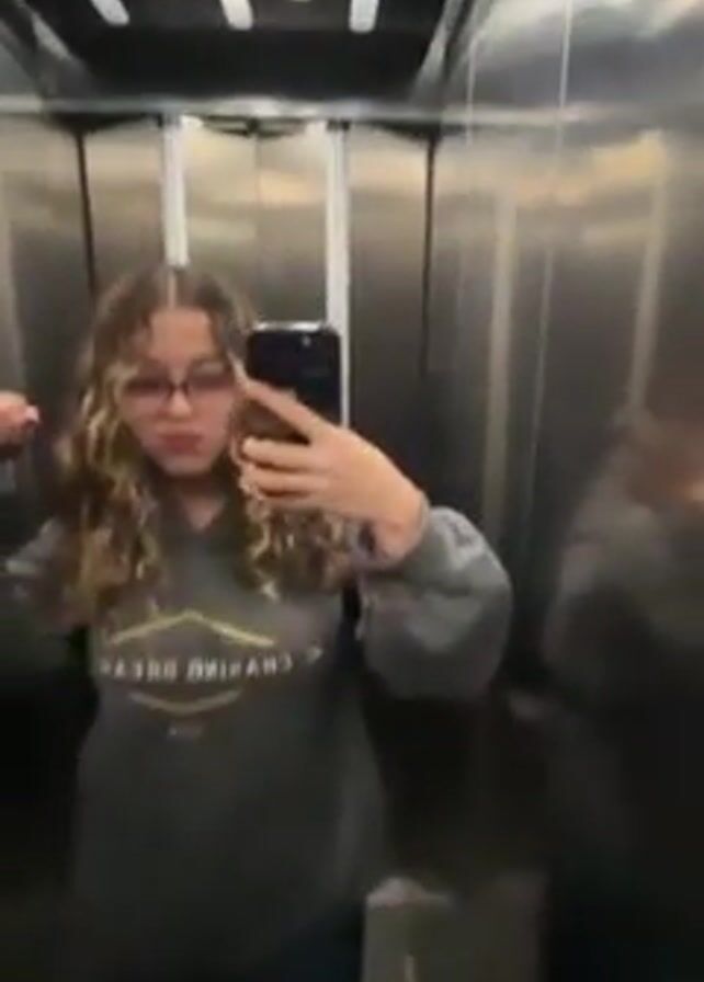 person taking a selfie in an elevator. The elevator has a silver metal interior, and the person is wearing glasses and a sweatshirt. The person is flexing their biceps and the elevator is moving, as indicated by the changing floor number display. The lighting in the elevator is provided by overhead lights.