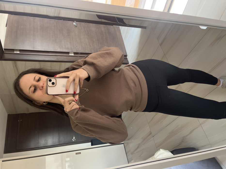 A young woman poses in a mirror selfie. She's wearing a brown, loose-fitting sweatshirt and black leggings. She holds a light-colored iPhone to take the photo. Her dark hair is long and straight. The background reveals a bathroom with beige floor tiles and a dark brown cabinet or door. The mirror frame is visible, creating a border around the scene.