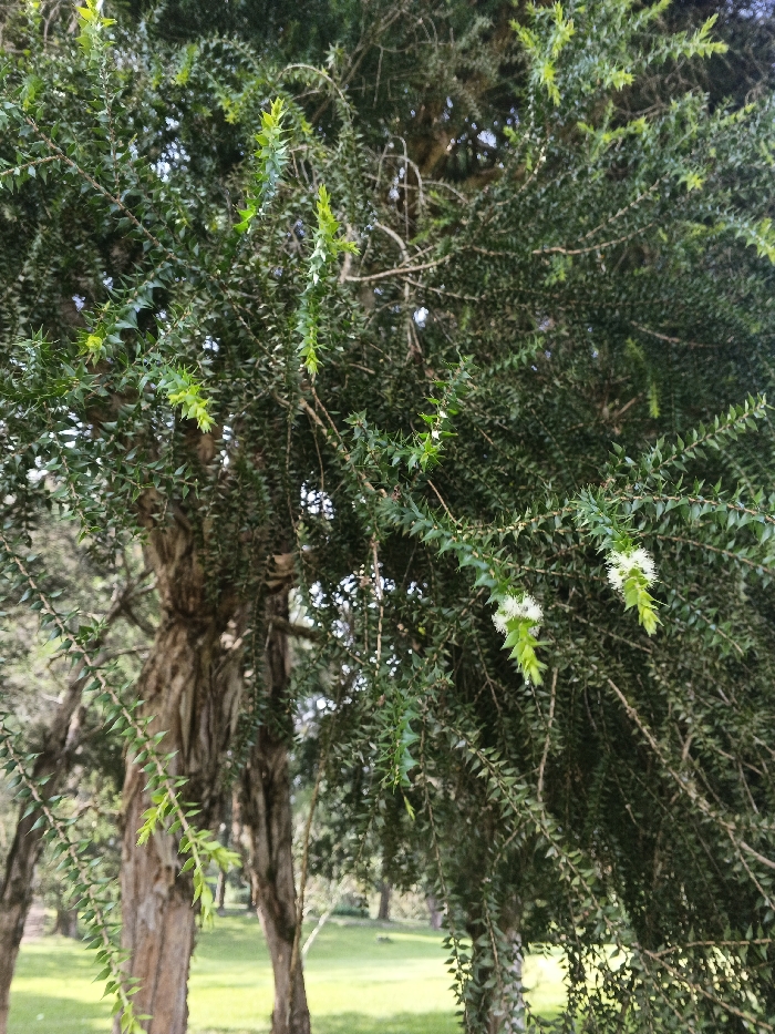 The image depicts a tree with small, dark green, spiky leaves densely covering its branches. Some branches bear white, elongated flowers. The tree's bark is a light brown color with a shredded texture. In the background, a green lawn and other trees are visible, suggesting a park or garden setting. The scene is captured in daylight.