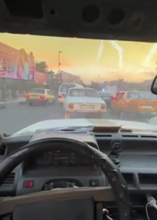 From the interior of a white car with a black steering wheel, the view looks out onto a congested road at dusk