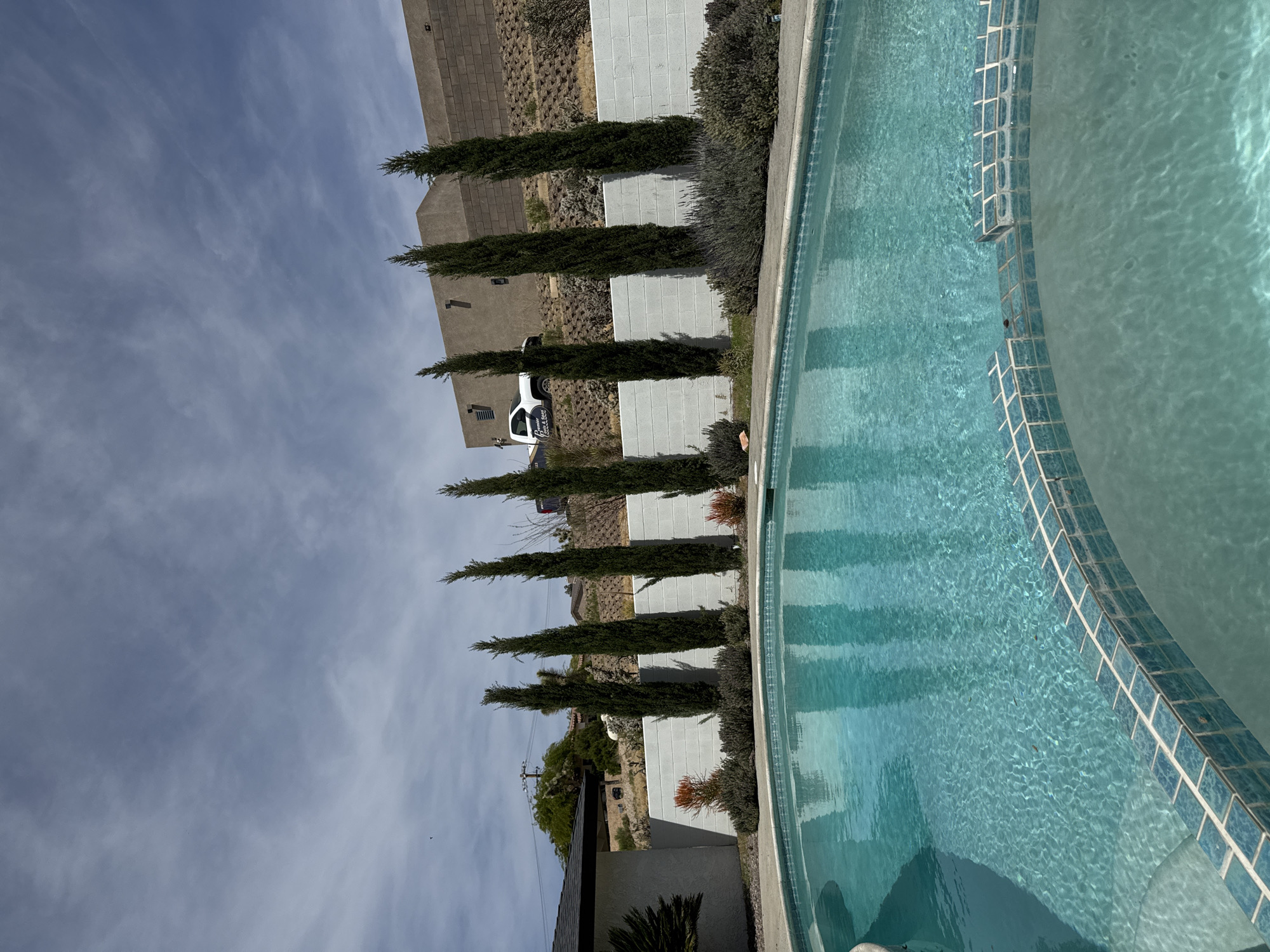 backyard swimming pool in Yucca Valley, California. The pool has blue tile trim and clear water with some debris on the surface. Along the side of the pool are several tall, thin, dark green trees planted in a row. Behind the trees are white retaining walls and hillside landscaping with desert vegetation. A multi-story building is visible in the background, along with a white vehicle. The sky is pale blue with wispy clouds.