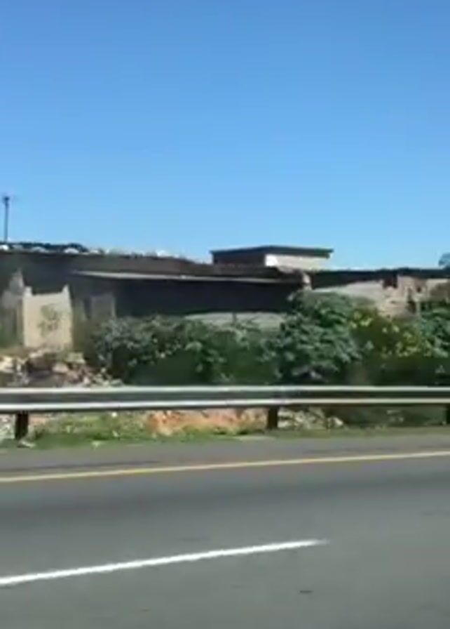 road scene, likely filmed from inside a moving car. The sky is clear blue. The roadside is visible with a metal guardrail. Beyond the guardrail, there is a small slope and vegetation with some rudimentary buildings or shacks constructed from what appear to be cinder blocks. Some structures have satellite dishes. The landscape looks dry and somewhat barren. A large white frame structure passes overhead on the road.