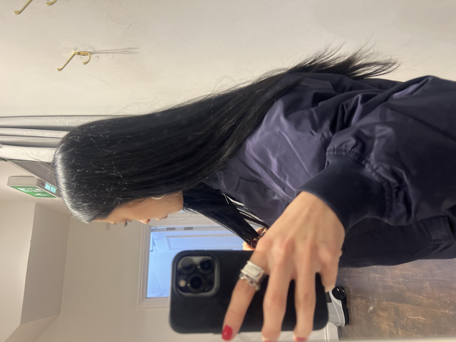 A person, likely female, is depicted from the left profile, capturing a mirror selfie with a black smartphone, specifically an iPhone with visible triple camera lenses. She has long, dark, straight hair and wears a navy blue bomber jacket with ribbed cuffs. Her visible left hand, painted with red nail polish, holds the phone. A silver-colored, chunky ring is present on her left ring finger. Small hoop earrings are worn on her left ear. The immediate background consists of a plain white wall. Two gold-colored coat hooks are mounted on this wall. High on the wall, a green and white emergency exit sign with a running man pictogram and an arrow pointing right is visible, indicating a UK or European standard. A light grey, textured curtain is partially visible on the upper right. The reflection on the floor shows dark wooden planks and a grey and black object, possibly a shoe or a small appliance. The scene is consistent with an indoor commercial or modern public building environment within the United Kingdom; however, specific identifiers to pinpoint an exact location within the city of London are not present.